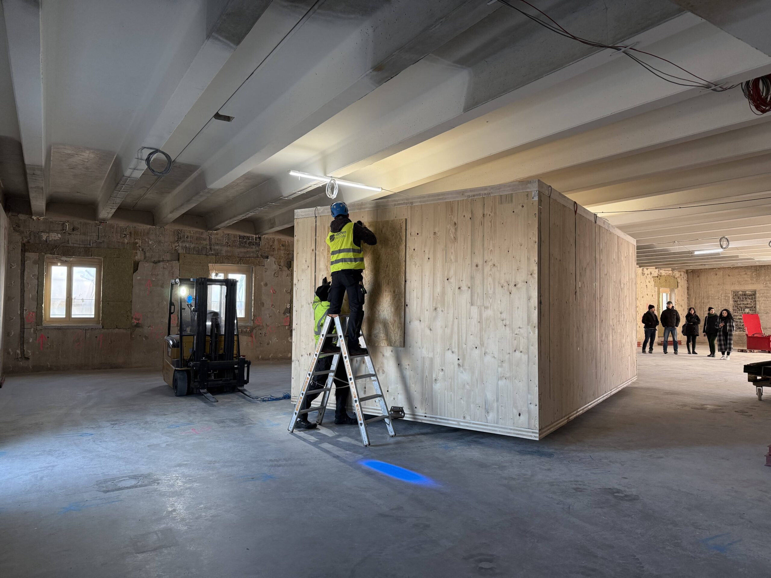 Die Zimmer des Projekts sind als vorgefertigte Holz-Raummodule konzipiert.